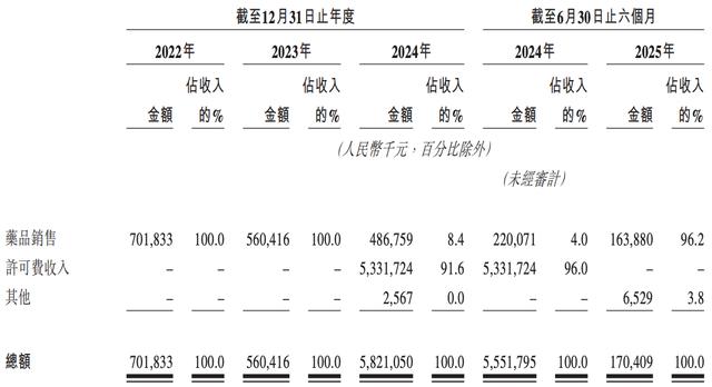 但细究可知,这主要和百利天恒获得的巨额许可费收入有关。2024年度,百利天恒确认许可费收入约为人民币53.32亿元,而2022年、2023年度和2025年上半年均未产生许可费收入。