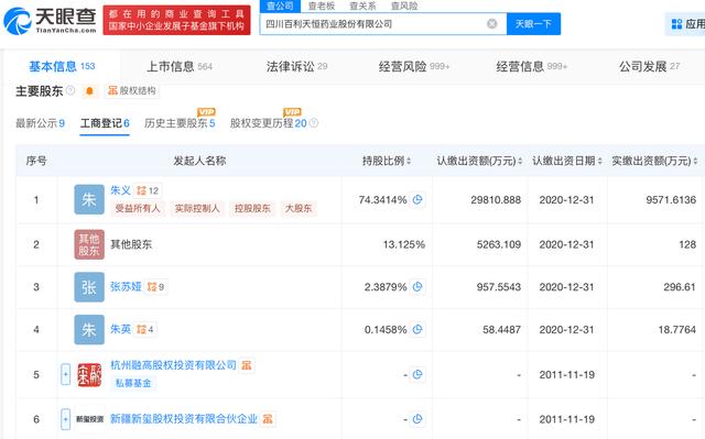 天眼查App信息显示,百利天恒成立于2006年8月,位于四川省成都市。目前,该公司的注册资本为4.01亿元,法定代表人为朱义,主要股东包括朱义、张苏娅、朱英、杭州融高股权投资有限公司等。
