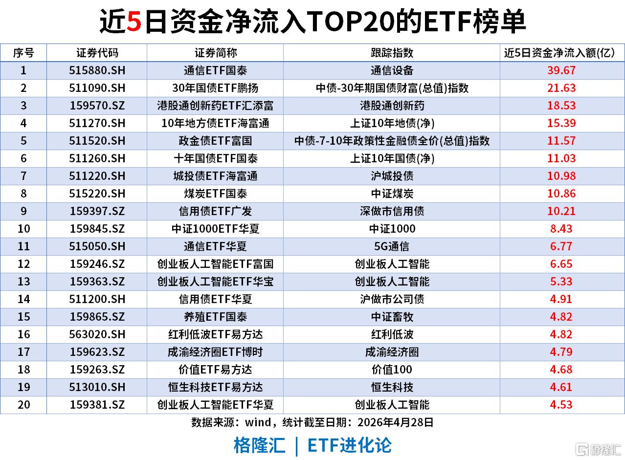中期资金呈现通信与固收双主线驱动的特征。通信ETF国泰以39.67亿净流入大幅领跑,通信ETF华夏同步录得6.77亿流入,通信板块成为中期资金配置的核心成长方向。
