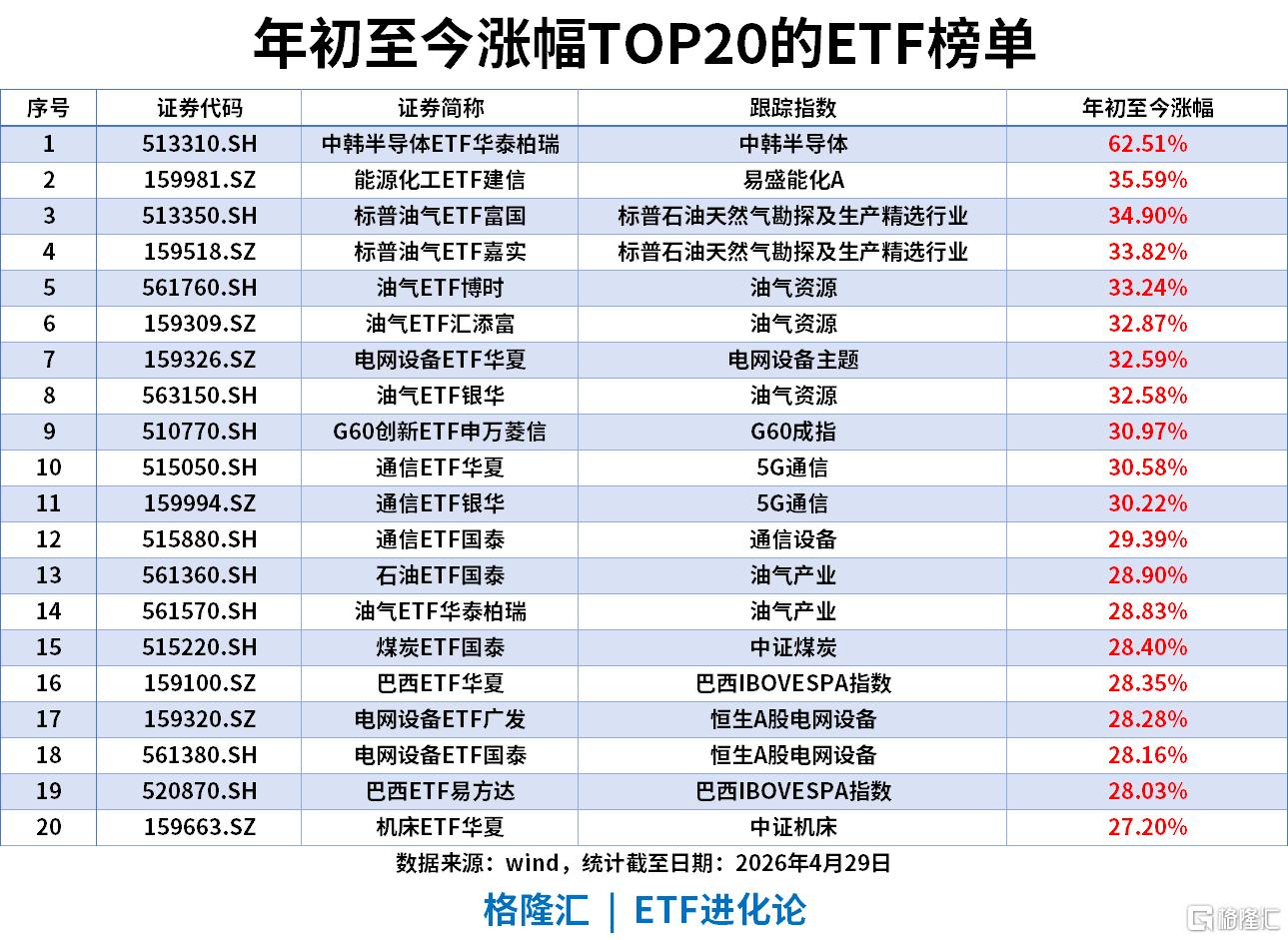 年度主线格局清晰稳固,中韩半导体ETF华泰柏瑞以62.51%的涨幅登顶年度最强ETF,成为成长赛道绝对龙头。能源化工ETF建信、标普油气ETF富国、标普油气ETF嘉实涨幅均超33%,电网设备ETF华夏以32.59%位列第7,通信ETF华夏、通信ETF银华、通信ETF国泰涨幅均超29%,形成“半导体+能源+通信”的年度多主线格局。