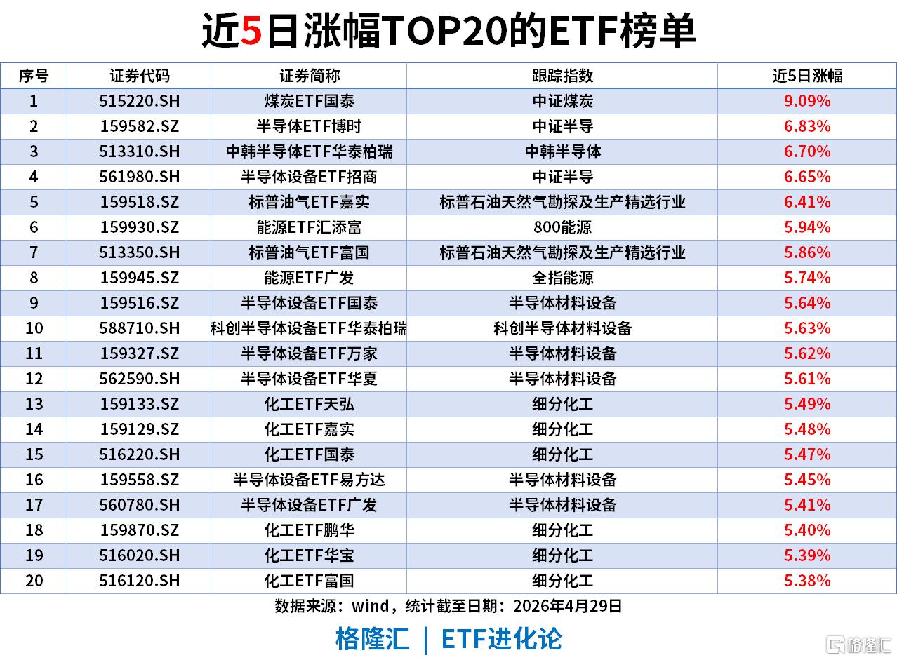 煤炭与半导体板块强势领跑,能源与科技成长形成双主线驱动格局。煤炭ETF国泰以9.09%的涨幅大幅领跑,半导体ETF博时、中韩半导体ETF华泰柏瑞、半导体设备ETF招商涨超5%。