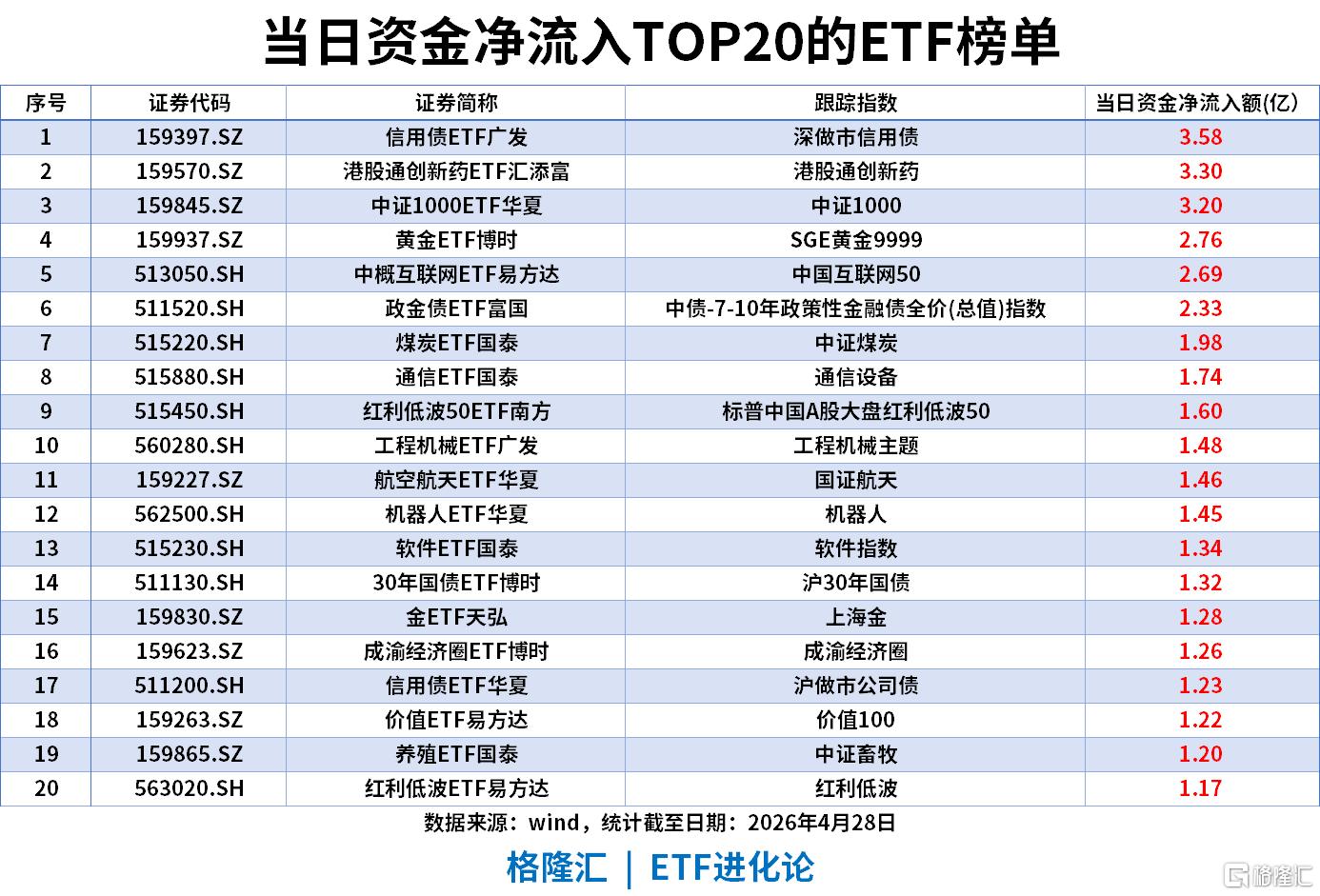 当日资金呈现债类打底、医药与宽基并行的格局。信用债ETF广发以3.58亿净流入领跑,港股通创新药ETF汇添富、中证1000ETF华夏紧随其后,分别录得3.30亿、3.20亿流入,医药与宽基赛道同步获资金青睐。