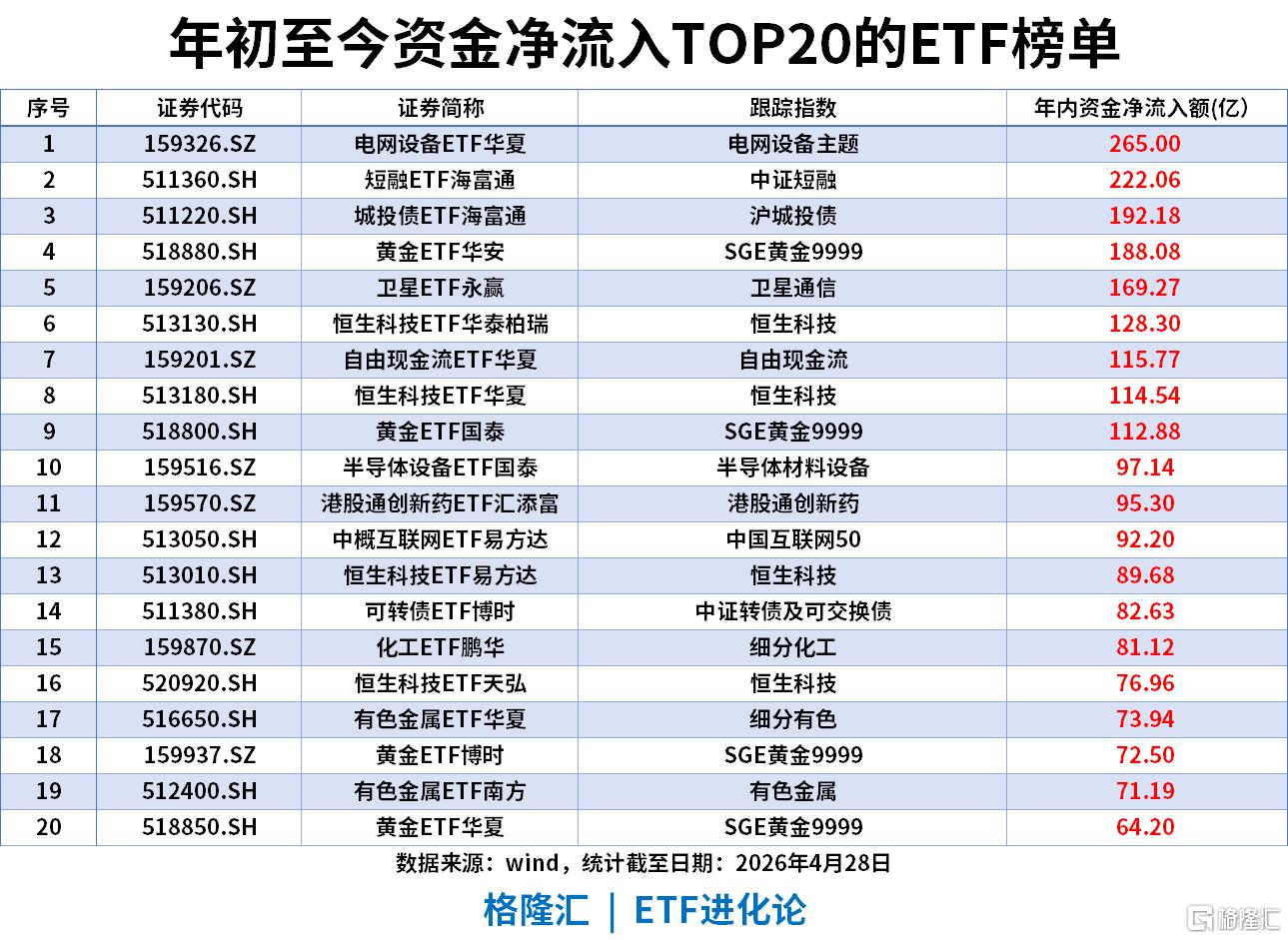 年度资金形成能源核心、黄金避险、科技成长的稳定格局,高景气赛道获长期重仓。电网设备ETF华夏以265亿成为年度吸金王,能源电力赛道全年获资金最高度认可,成为贯穿全年的核心配置方向。黄金ETF华安、黄金ETF国泰合计流入超370亿,短融ETF海富通、城投债ETF海富通等固收品种亦流入超400亿,避险与稳健需求贯穿全年。