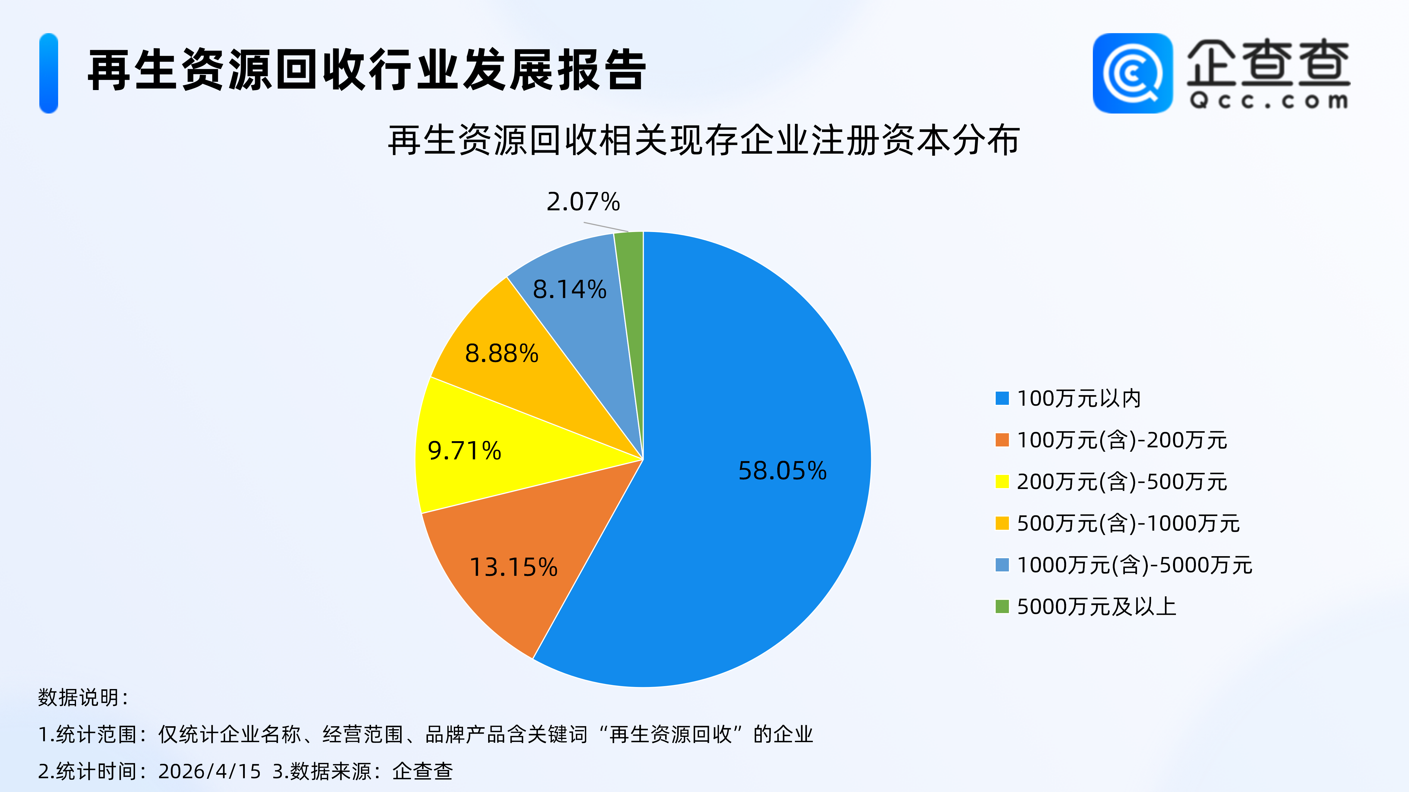 企查查数据显示,注册资本分布上,国内再生资源回收相关现存企业中,注册资本在100万元以内的企业最多,占比58.05%,超过半数企业,呈现小微规模特征。此外,注册资本在1000万元(含)至5000万元的企业占比8.14%,5000万元及以上的企业占比2.07%,两者合计,注册资本在千万元及以上的相关企业合计占比10.21%,显示出行业整体以中小微企业为主、头部大资本企业占比较低的格局特征。