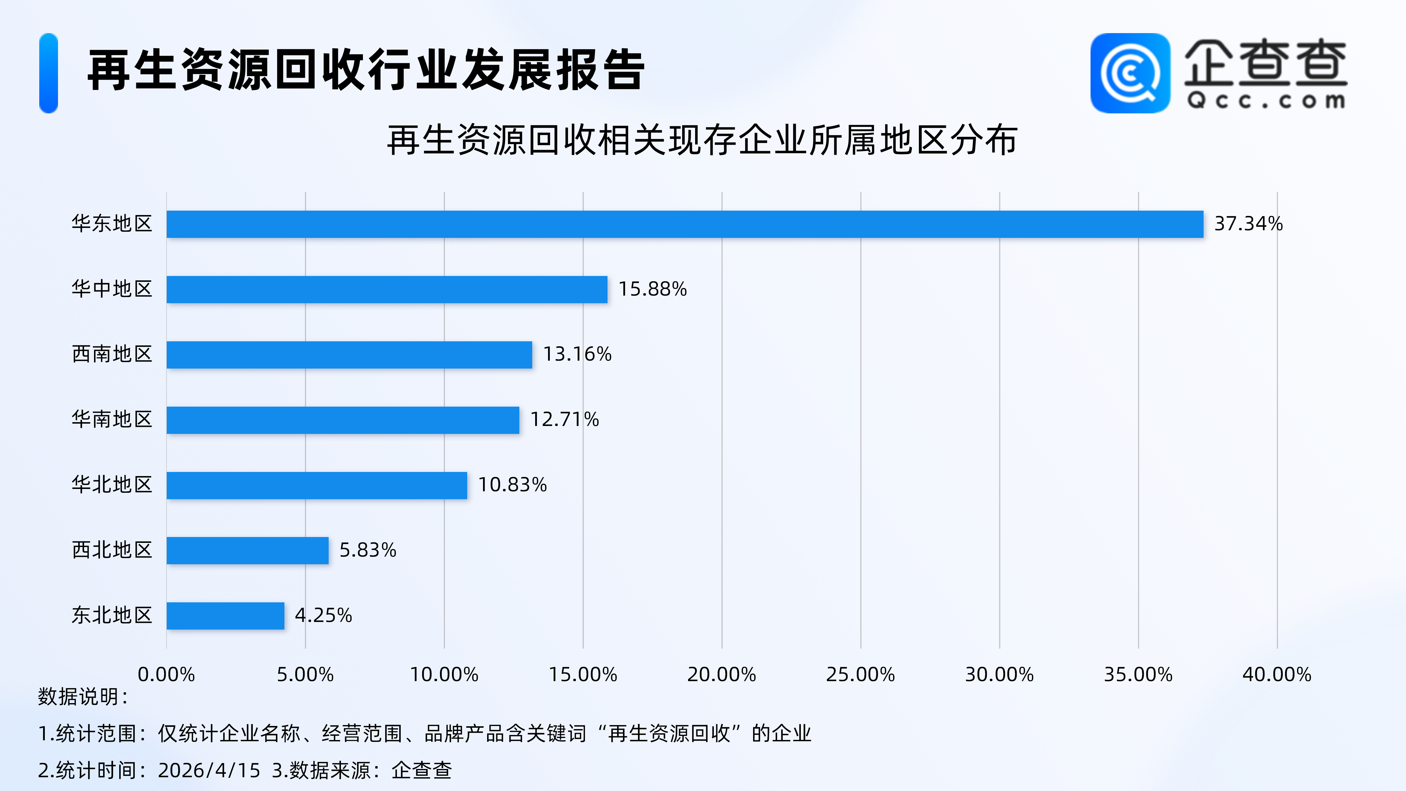 企查查数据显示,区域分布方面,华东地区以38.67万家再生资源回收相关现存企业、占比37.34%高居首位,凭借经济发达、产业配套完善的优势,成为再生资源回收相关企业最集中的区域。华中、西南、华南、华北四地的相关企业占比均在10%-20%之间。其中华中地区占比达15.88%,西南地区占比13.16%。相比之下,西北地区占比5.83%;东北地区占比4.25%,两个地区合计占比不足12%。