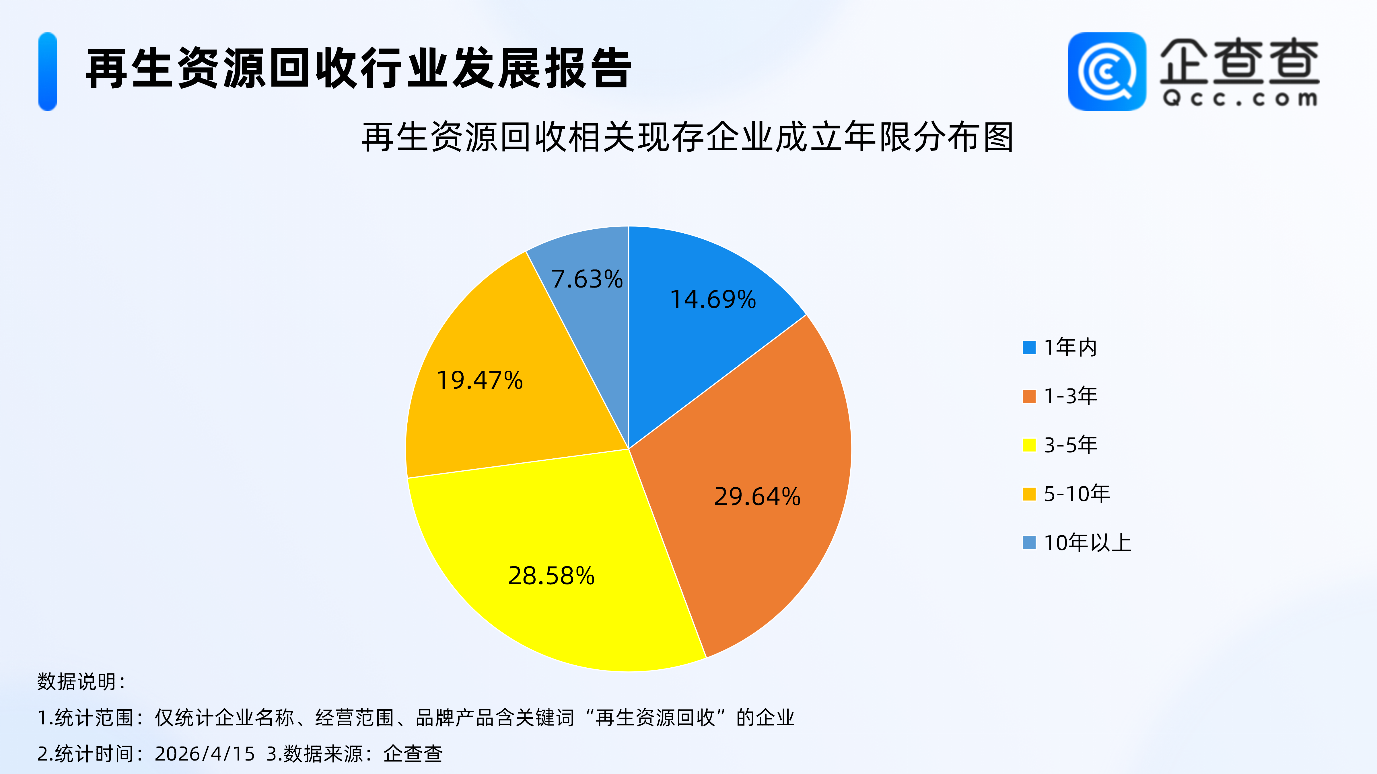 企查查数据显示,近十年再生资源回收相关企业存量呈稳定增长趋势,2016年末存量达11.02万家,截至2025年末,相关企业存量已突破100万家,达100.58万家。截至4月15日,国内现存再生资源回收相关企业达103.57万家。