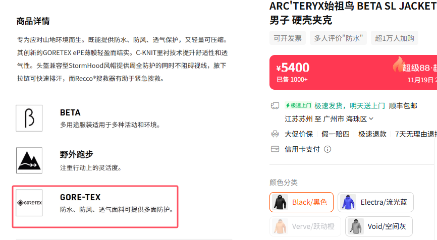 ▲售价5400元的始祖鸟冲锋衣宣传使用了GORE-TEX面料,来源于电商平台。