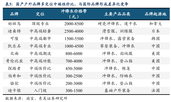 价格方面,当前国产品牌与国际品牌已形成差异化竞争格局。东吴证券的研报指出,国际品牌多定位中高端,冲锋衣价格带基本在数千元,主要面向专业户外人群或中高收入人群。而如伯希和、骆驼等国产品牌冲锋衣基本定价3000元以内,且其核心销售款集中在千元内,面向主流消费人群。