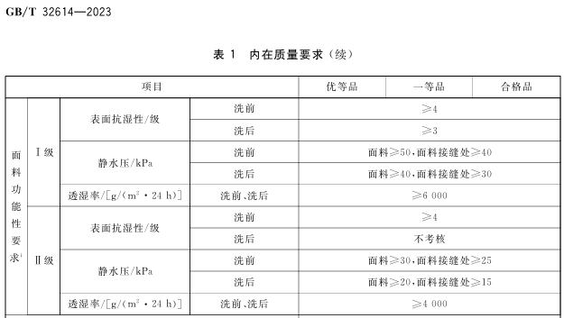 ▲冲锋衣国标对于面料功能性要求