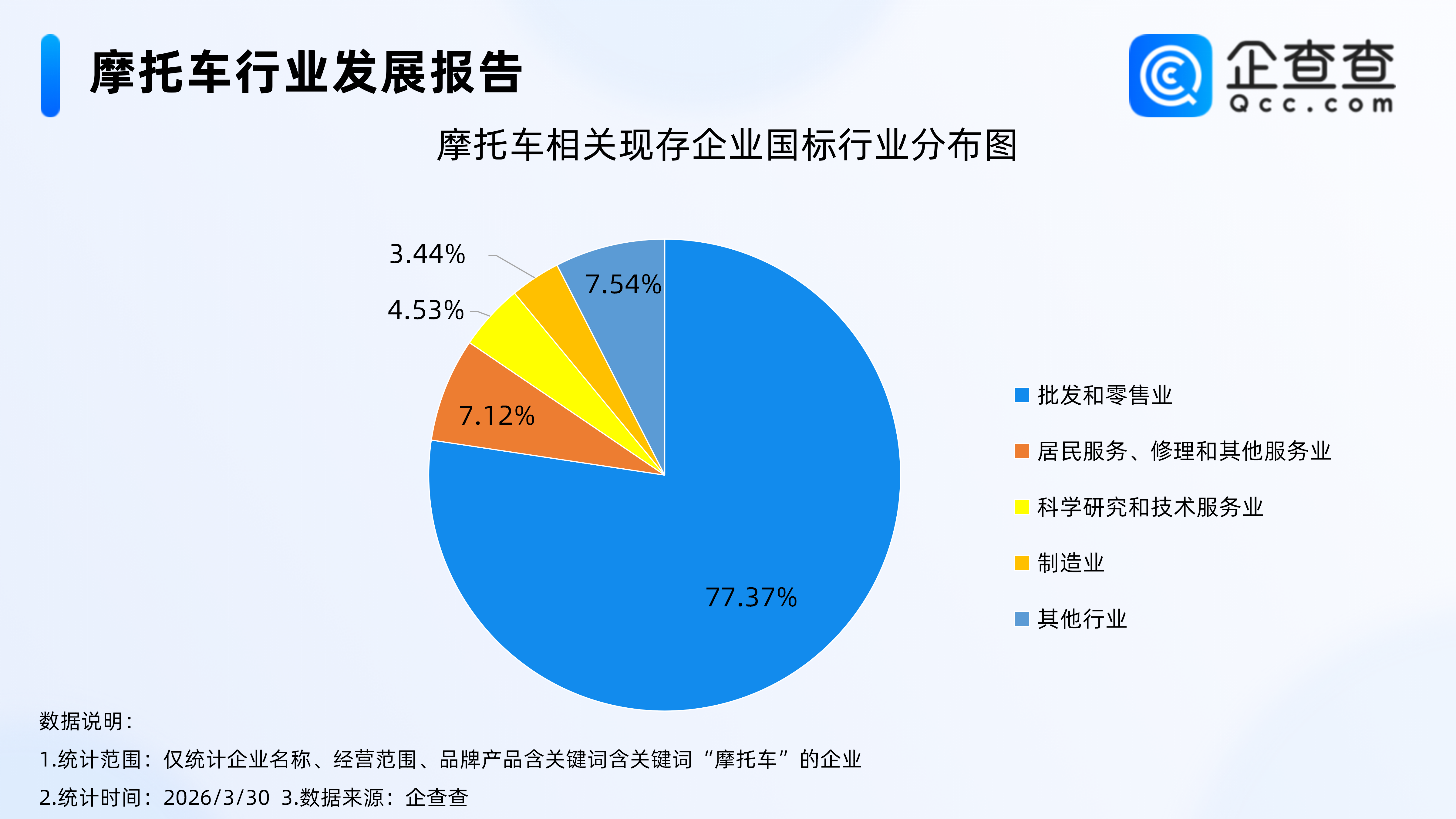 企查查数据显示,从国标行业分布来看,国内摩托车相关企业业态集中于流通领域。其中,归属于批发和零售业的相关企业占比高达77.37%,成为行业主体;居民服务、修理和其他服务业占比7.12%,科学研究和技术服务业占比4.53%,制造业占比3.44%。