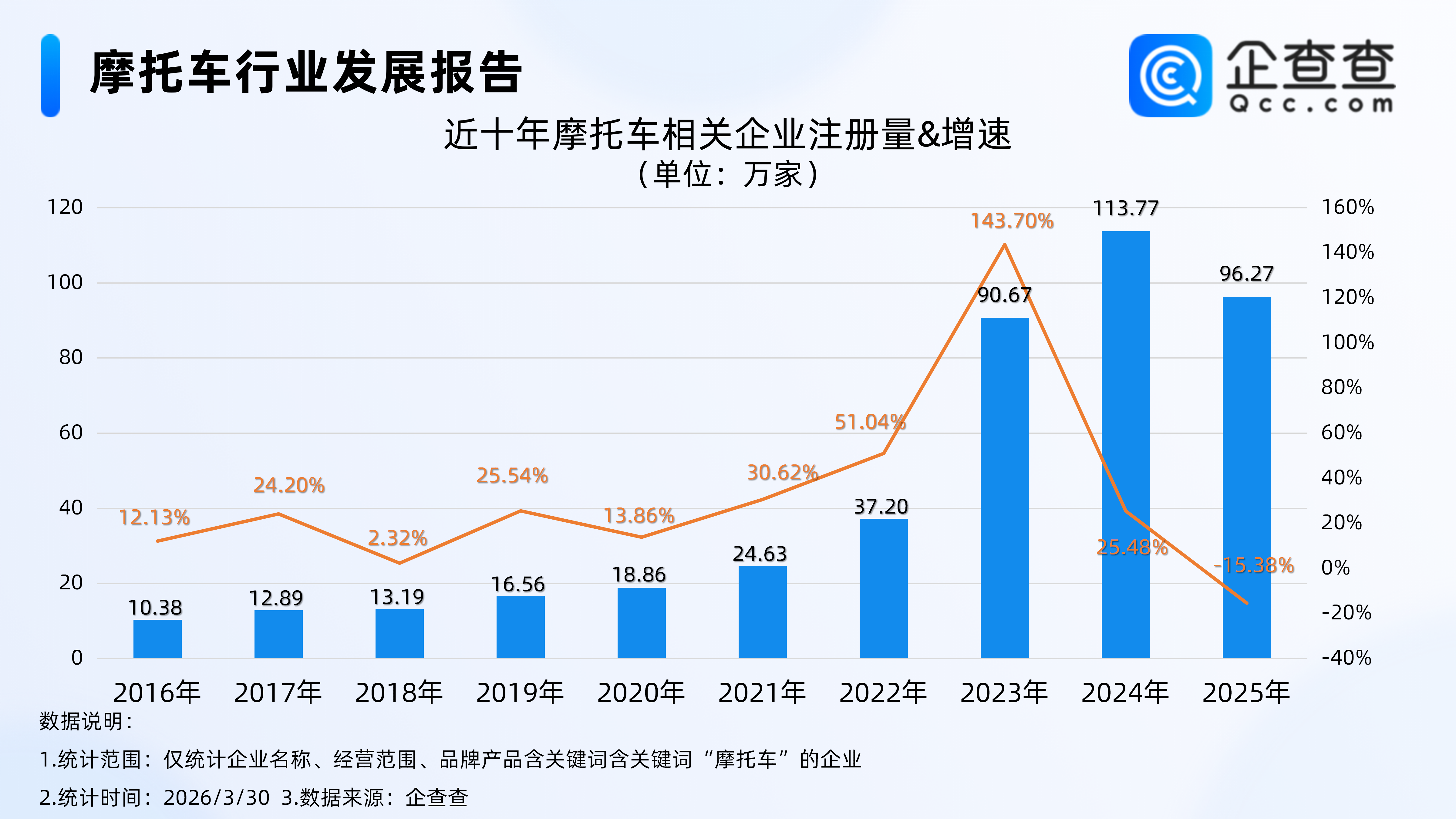 企查查数据显示,注册量方面,近十年国内摩托车相关企业注册量整体呈上升趋势,2023年起迈入高速增长阶段。2016年-2022年,每年注册量基本在10万家-40万家区间。2023-2025年连续三年注册量超90万家,2023年注册量90.67万家,增速143.70%,达近十年注册增速峰值;2024年注册量达113.77万家,2025年注册量回调至96.27万家。截至目前,2026年已注册17.08万家相关企业。