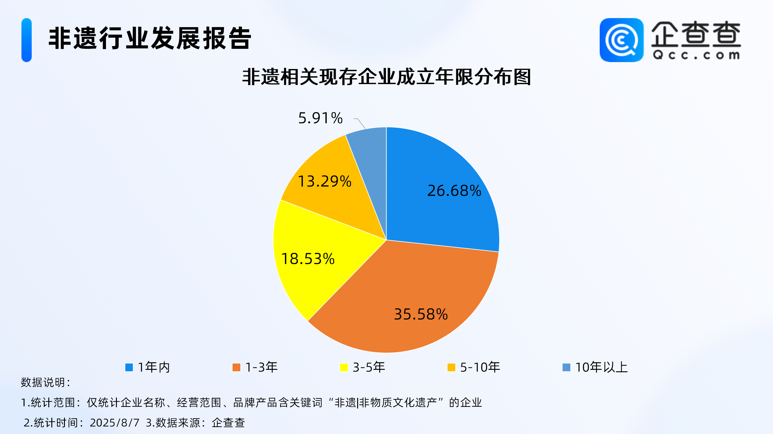 企查查数据显示,从成立年限来看,国内非遗相关现存企业中,超6成相关现存企业成立于近3年。其中成立年限在1-3年的相关现存企业最多,占比达35.58%,成立年限在1年内的相关现存企业,占比达26.68%。