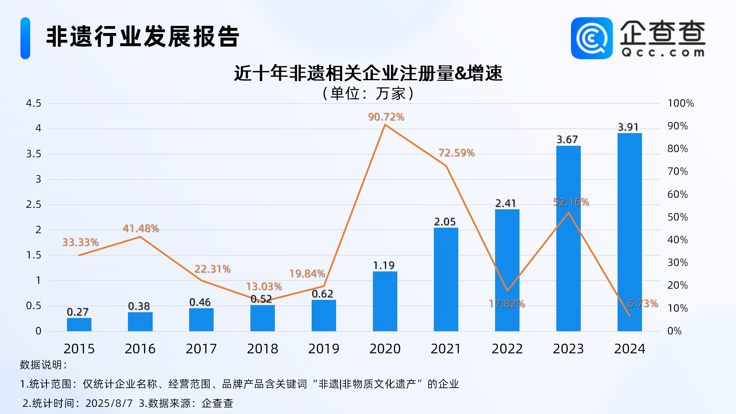 企查查数据显示,从注册量角度来看,近十年非遗相关企业注册量呈稳定上升趋势,2024年注册量达3.91万家,同比增长6.73%,截至目前,今年已注册2.82万家,其中前7月注册量达2.75万家,同比增长23.81%。