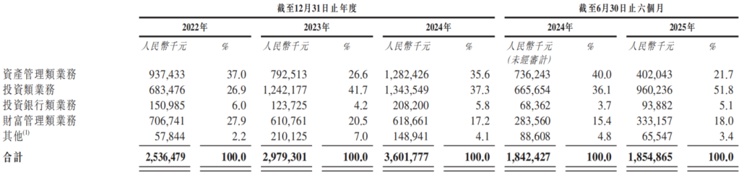 资管与投资类业务构成公司核心收入,合计收入占比从2022年的63.9%,升至2023年的68.3%,再增至2024年的72.9%。