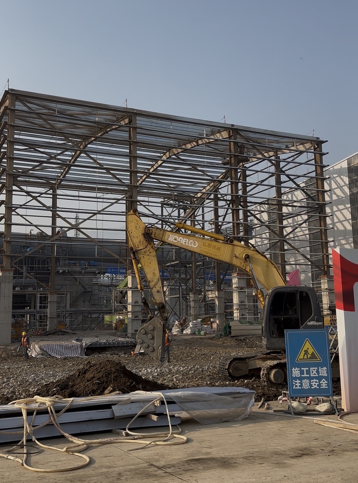 1月15日下午,国城锂业项目现场一片繁忙。时代周报记者看到,运输车辆穿梭往来,挖掘机在一座钢结构主体已成的厂房前展开作业,旁边另一座大型厂房已搭建好。