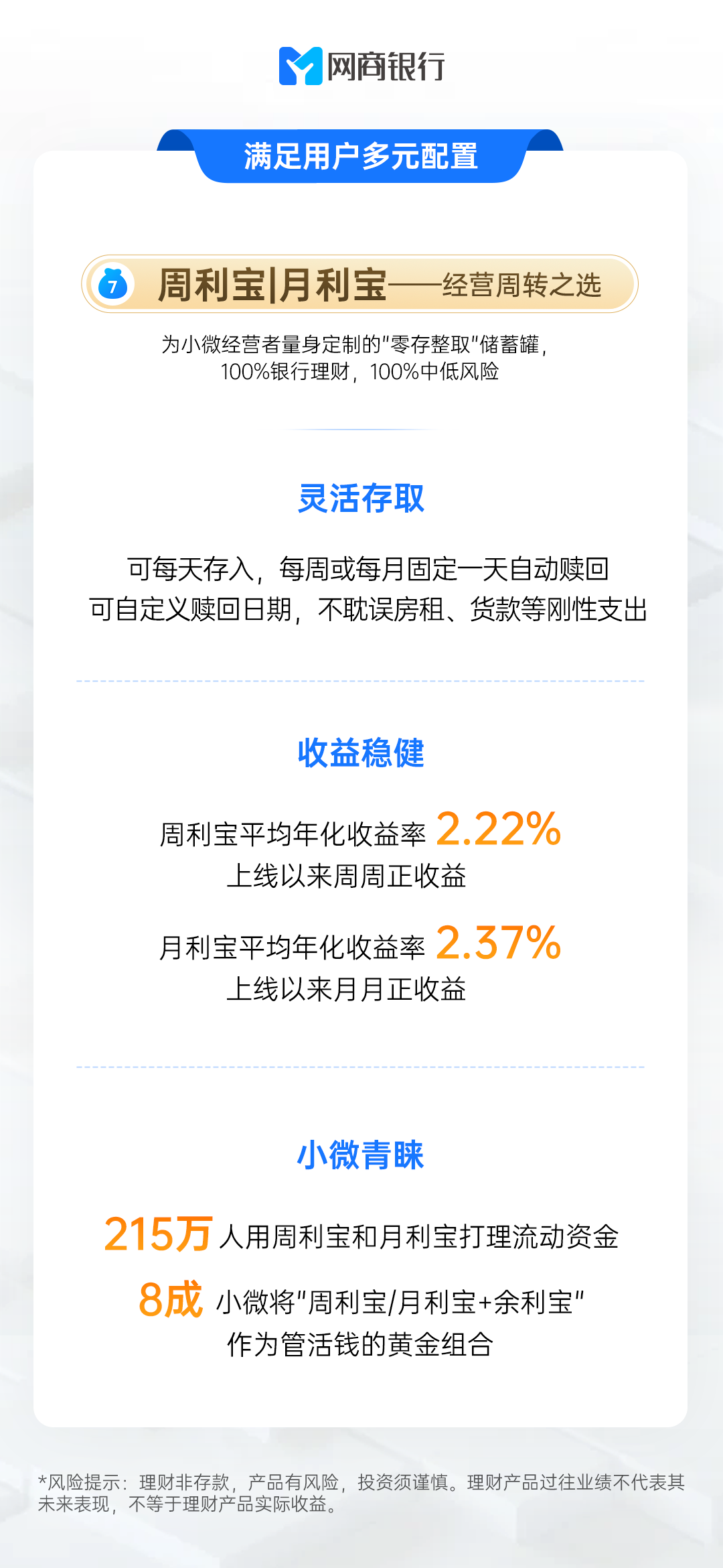 针对零散资金积累与周期性支出需求,“周利宝”与“月利宝”支持每日存入并按周或按月自动赎回,贴合房租、货款、工资等支出节奏,平均年化收益率介于2.2%~2.37%之间,已成为超215万用户管理周转资金的选择。