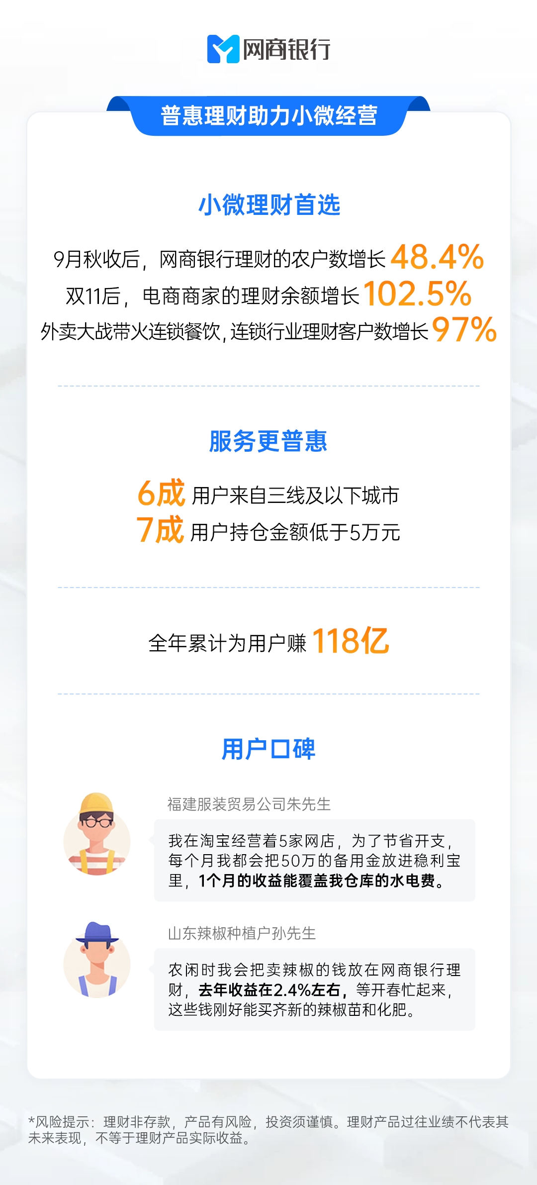 作为银行理财代销平台,网商银行通过严格选品与专业运作,让数千万小微客群也能享受到安全稳健的资产配置服务。