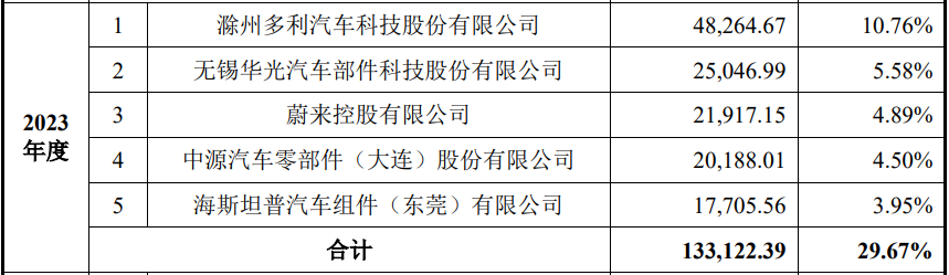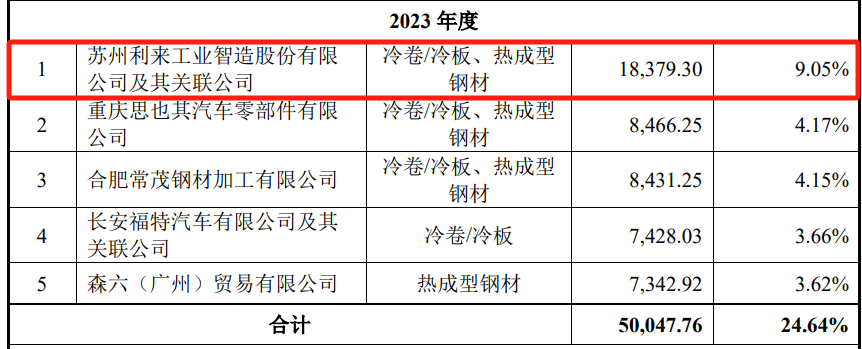 在信息披露方面,至信股份也陷入了迷雾之中。在至信股份披露的前五名供应商中,2023 - 2025年上半年苏州利来工业智造股份有限公司及其关联公司为第一大供应商,向至信股份供应冷卷/冷板、热成型钢材,其中2023年至信股份向苏州利来采购金额为1.84亿元。然而,在深交所公布的苏州利来招股书中,2023年前五大客户中并未出现至信股份。按照至信股份披露的采购金额1.84亿元,应该排在苏州利来2023年前五大客户的第五名,但苏州利来招股书显示其第五名客户销售额为1.77亿元,并说明了按照同一控制下合并口径披露。按照苏州利来的披露数据来看,2023年对至信股份的销售金额应该低于1.77亿元。