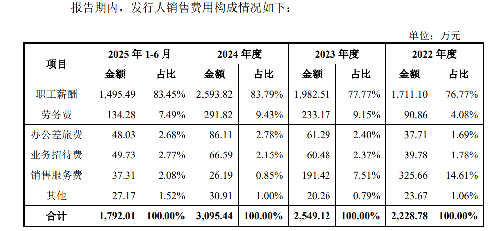 至信股份的销售费用在报告期内逐年攀升,2022年至2025年1 - 6月,至信股份销售费用分别为2228.78万元、2549.12万元、3095.44万元和1792.01万元,占营业收入比重分别为1.07%、0.99%、1.00%和1.12%。相对于同行业企业,至信股份的销售费用高得惊人,直接翻倍,让人觉得匪夷所思。