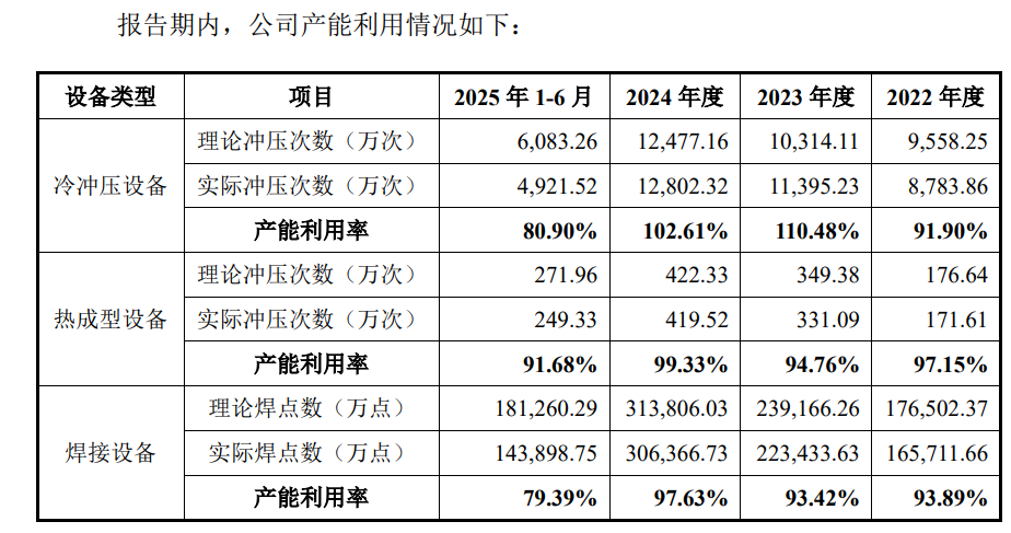 至信股份本次IPO拟募集资金13.29亿元,主要投向重庆、宁波、安徽三大基地“冲焊生产线扩产能及技术改造项目”及补充流动资金。然而,公司的扩产计划与当前产能利用率下降的趋势形成了鲜明对比。2025年上半年,公司冷冲压设备产能利用率由102.61%降至80.90%,热成型设备产能利用率由99.33%降至91.68%,焊接设备产能利用率由97.63%降至79.39%。