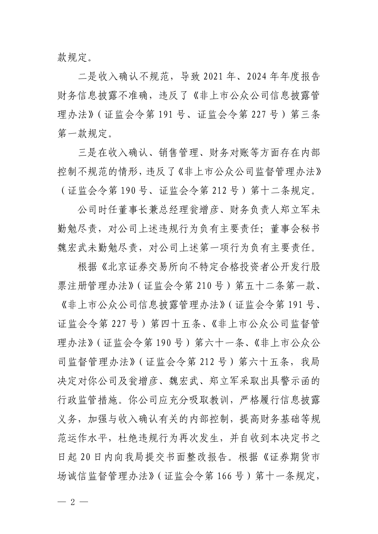 以上行为违反了《北京证券交易所向不特定合格投资者公开发行股票注册管理办法》《非上市公众公司信息披露管理办法》《非上市公众公司监督管理办法》的规定。公司时任董事长兼总经理瓮增彦、财务负责人郑立军、董事会秘书魏宏武未勤勉尽责,对公司上述行为负有主要责任。