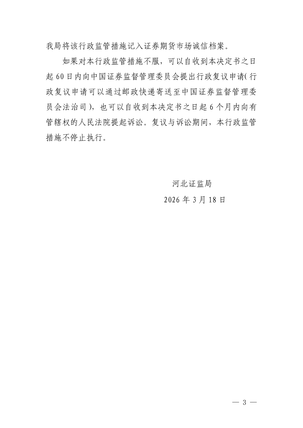 蓝鲸新闻3月20日讯,近日,河北证监局发布行政监管措施决定书,剑指唐山天和环保科技股份有限公司及相关责任人。