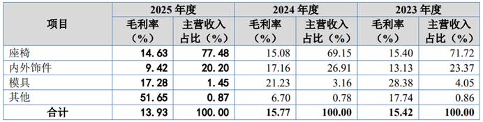 双英集团的财务状况堪称一团乱麻,盈利质量低下与流动性危机如同两颗定时炸弹。2023年至2025年,双英集团主营业务毛利率分别为15.42%、15.77%和 13.93%,座椅、内外饰件及模具主营业务收入占比合计分别为 99.14%、99.22%和 99.13%,是构成主营业务收入的主要产品,也是影响主营业务毛利率波动的主要产品。其中,座椅毛利率分别为15.4%、15.08%、14.63%,呈持续下滑态势;内外饰件毛利率分别为13.13%、17.16%、9.42%,存在一定波动。这些数据直观地反映出其新能源业务转型的艰难处境以及整体盈利能力的不断下滑。