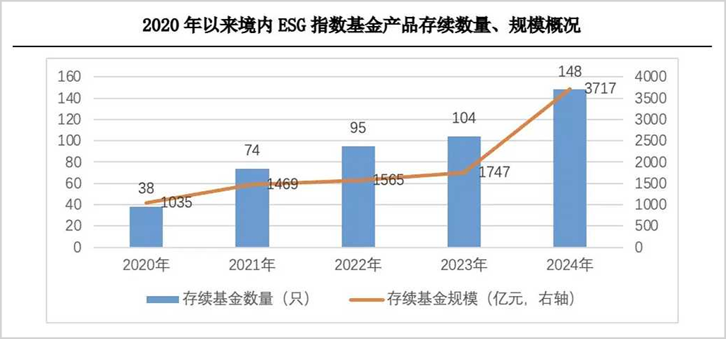 Wind数据显示,截至2024年底,我国境内存续ESG指数基金产品数量和规模已分别达到148只和3717亿元人民币,而在2020年,这一数据还分别只有38只和1035亿。