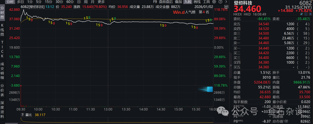 如果高点42.88港元买入,截至收盘,壁仞科技涨幅只有76%,一手亏损1684港元,该公司股价自高点跌幅高达20%,在二级市场参与的基本都亏损出局。