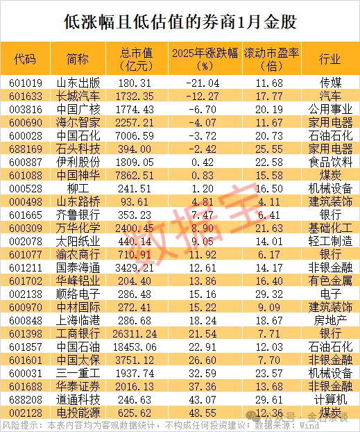 数据宝还统计了低涨幅且低估值的券商1月金股,大家可以看下,不过老登股居多。