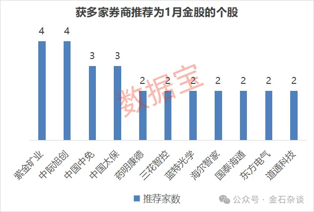 据数据宝统计,推荐1月金股的券商个数如下。其中,中际旭创和紫金矿业被推荐最多,还有中国中免、三花智控等。