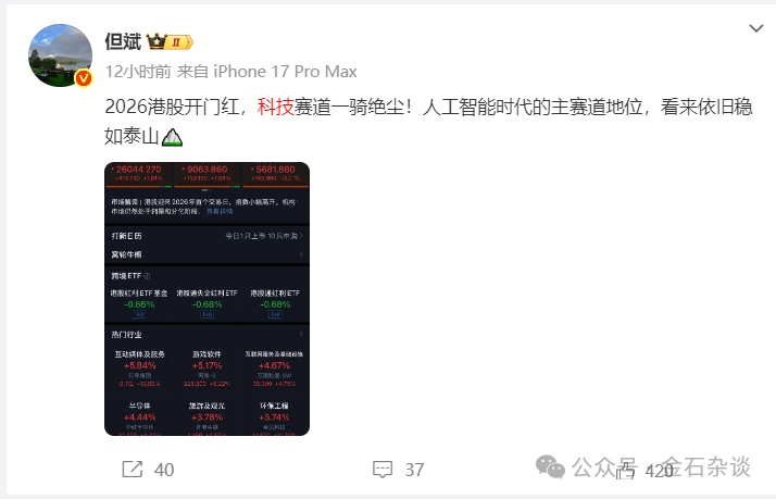 其中,但斌对此高呼:2026港股开门红,科技赛道一骑绝尘!人工智能时代的主赛道地位,看来依旧稳如泰山。