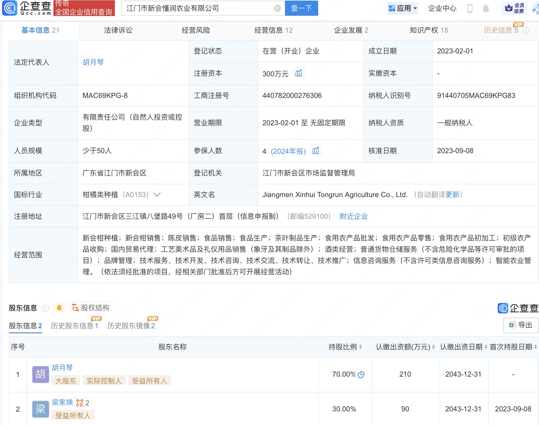 企查查APP显示,涉事公司江门市新会区古道柑普茶业有限公司成立于2017年,经营范围含茶叶制品生产、陈皮销售等,由颜财源全资持股。此外,涉事公司江门市新会懂润农业有限公司成立于2023年,经营范围含新会柑种植、新会柑销售、陈皮销售等,由胡月琴、梁家焕共同持股。
