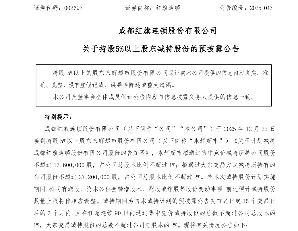 蓝鲸新闻12月23日讯(记者 孙煜)12月22日晚,红旗连锁发布公告,持股5%以上股东永辉超市因自身资金需求,拟通过集中竞价、大宗交易的方式,合计减持不超过公司总股本3%的股份。