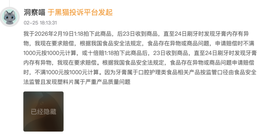 2026年2月,有消费者在黑猫投诉平台反映,其购买的参半品牌牙膏内发现异物(塑料片),该消费者依据《食品安全法》要求1000元赔偿或十倍赔偿。投诉指出,牙膏作为口腔护理类食品相关产品,发现塑料片属于严重产品质量问题。