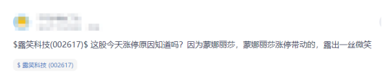 有意思的是,在股票讨论区中,又投资者表示该股今天的涨停是蒙娜丽莎涨停带动,因为蒙娜丽莎露出了一丝微笑。