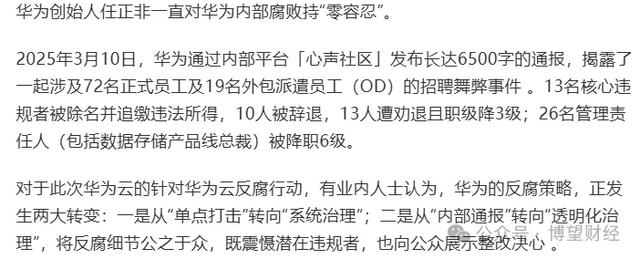 华为创始人任正非对内部腐败一直持“零容忍”态度。据《财联社》等报道,2025年3月10日,华为通过内部平台“心声社区”通报了一起涉及72名正式员工和19名外包员工的招聘舞弊事件。此次对云计算高管的问责,是这一治理逻辑的延续和强化。
