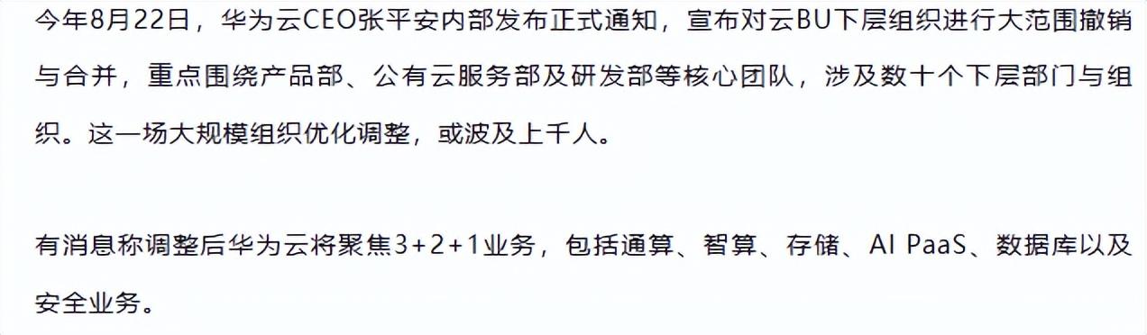 据《上海法治报》等多个媒体报道,2025年8月,张平安发布内部通知,宣布对云BU下层组织进行大范围撤销与合并,重点围绕产品部、公有云服务部及研发部等核心团队,涉及数十个部门,波及上千人。有消息称,组织架构调整后,华为云明确聚焦“3+2+1”业务方向,即通算、智算、存储三大基础业务,AI PaaS、数据库两大平台业务,以及安全业务。