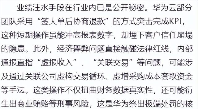 根据调查结果,华为云部分团队采用了“签大单后协商退款”的方式突击完成KPI。据《粼粼凛凛》等报道,这种操作手法虽然能够在短期内美化业绩报表,但却严重损害了业务的真实性和可持续性。经济舞弊问题更是直接触及法律红线。内部通报直指“虚报收入”、“关联交易”等违规行为,可能涉及通过关联公司虚构交易循环、虚增采购成本套取资金等手法。这类行为不仅扭曲了财务数据的真实性,更可能衍生出商业贿赂等刑事风险。