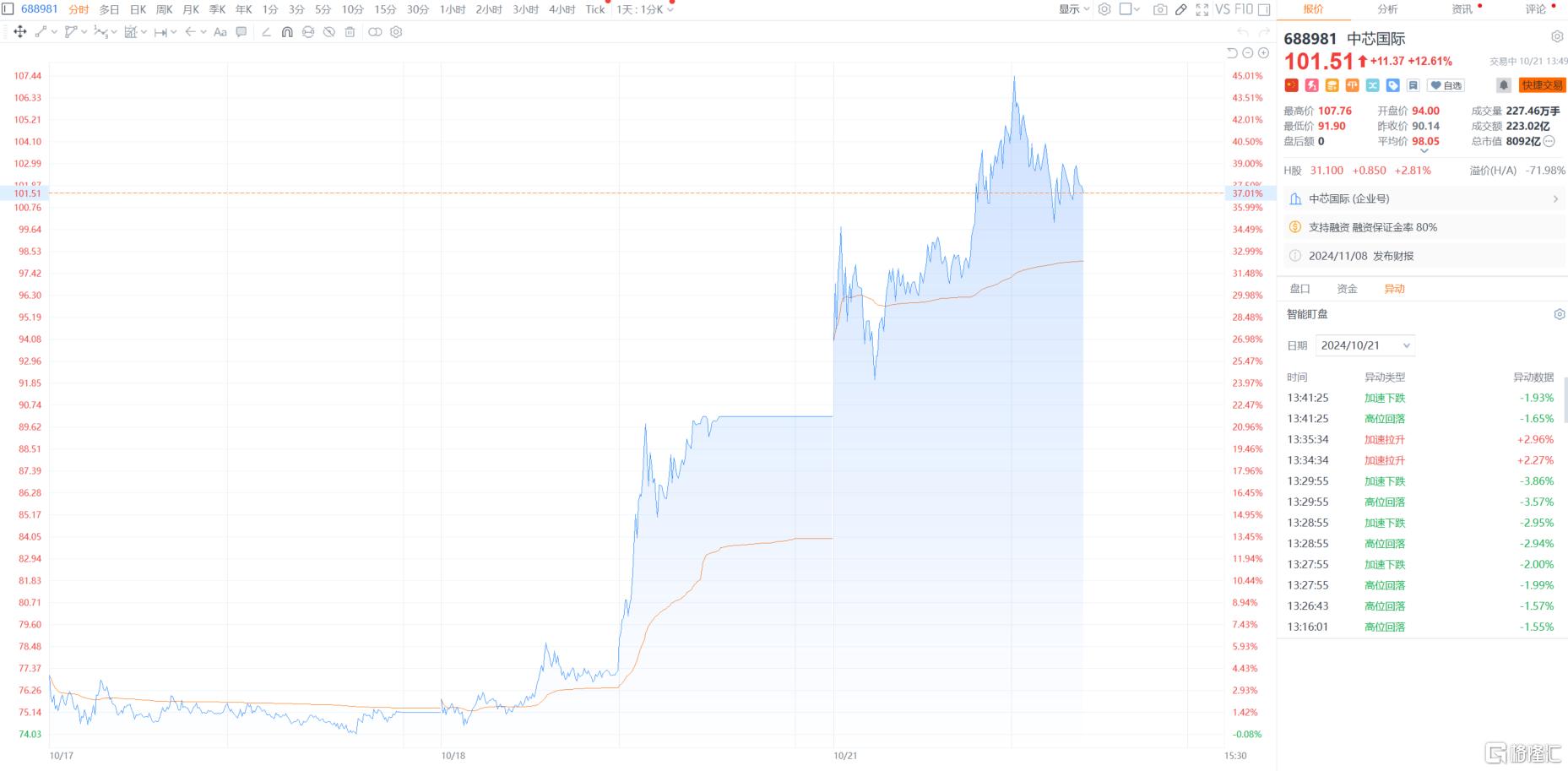 继上周五涨停后,“A股芯片龙头”中芯国际继续狂拉,一度涨近19%,股价创下历史新高。现涨幅有所回落至12%报101.51元,总市值8092亿元。