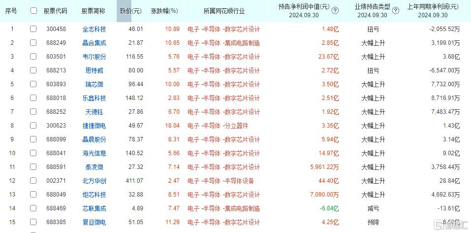 据同花顺数据显示,截至目前已披露三季度预报的15家半导体企业中,近9成预喜。