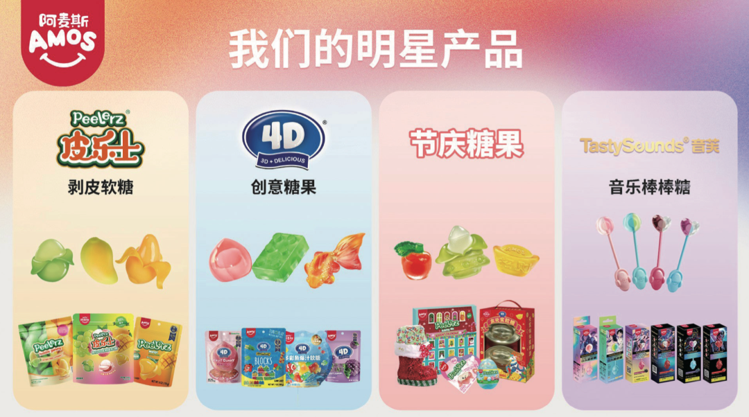 譬如,皮乐士Peelerz软糖:以芒果造型为代表性、标志性水果味剥皮软糖以其独特的口感及互动式的“剥皮”体验重新定义了消费者体验;4D(“3D+Delicious”)积木软糖:通过引入有趣的“可拼搭”的积木软糖,水果、动物造型形式,成功开创了一个全新的创意软糖品类;节庆糖果:多年来,阿麦斯食品为中国新年、情人节、复活节、万圣节、圣诞节等而创设的节庆糖果产品在全球主要连锁零售店及电商平台实现了稳定的销售增长;音芙传声棒棒糖:包括音乐棒棒糖和其他文化内容棒棒糖,印证了阿麦斯食品将文化元素及科技融入糖果的能力,实现跨界创新。