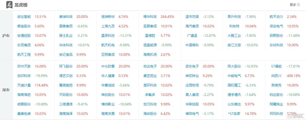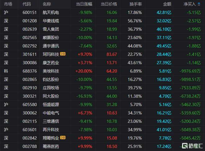 龙虎榜单日净卖出额前三为航天机电、华菱线缆、雪人股份,分别为5.15亿元、2.57亿元、1.99亿元。