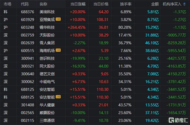 龙虎榜中涉及机构专用席位的个股中,单日净卖出额前三为美埃科技、锡华科技、天际股份,分别为1.37亿元、1.13亿元、9005.77万元。