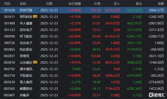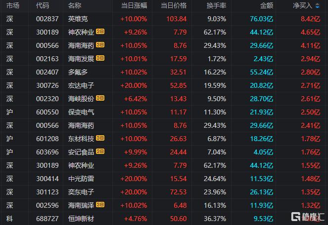 龙虎榜单日净买入额前三为英维克、多氟多、宏达电子,分别为8.42亿元、2.8亿元、2.71亿元。