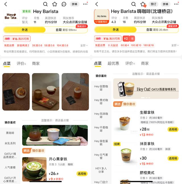 从美团外卖菜单看,两家店在产品设置上有很大差异。Hey Barista上海店共有17款单品(不含双杯套餐等套餐);而Hey Barista嗨咖啡杭州店产品线更丰富,共有28款单品(不含双杯套餐等套餐),并新增了创意咖啡和烘焙产品线;但Hey Barista上海店独有米乳系列饮品,Hey Barista嗨咖啡杭州店并未上架。