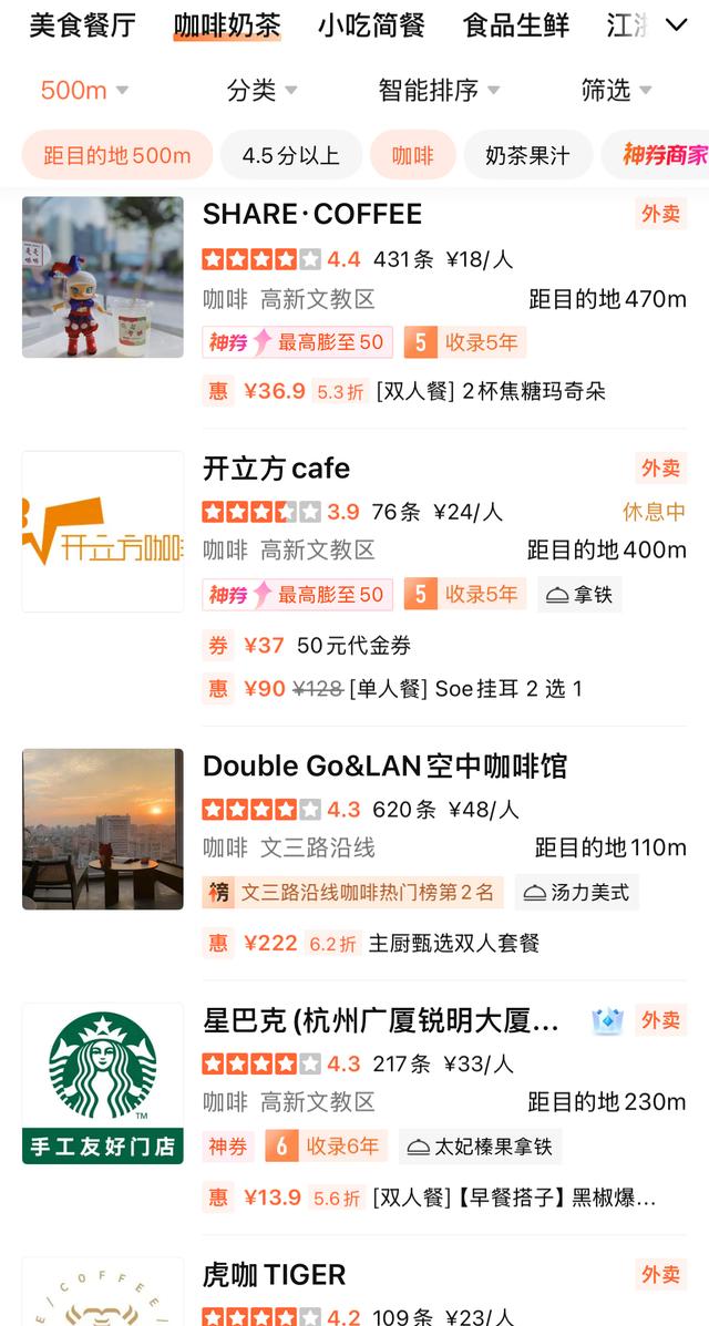 值得注意是,该区域咖啡市场竞争激烈。大众点评显示,该咖啡店500米内,至少有21家咖啡店,其中包括瑞幸、库迪、Pull-Tab拉环咖啡、星巴克等连锁咖啡品牌,也有虎咖TIGER、Double Go&LAN空中咖啡馆、SHARE·COFFE等小众精品咖啡店,其中,像星巴克和Double Go&LAN空中咖啡馆这样具备充足座位、适合久坐洽谈的“第三空间”型门店,与Hey Barista的目标客群高度重叠。