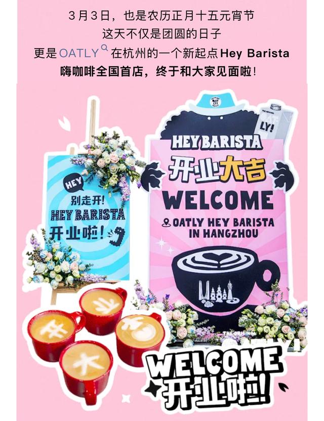 3月3日,OATLY在杭州开了一家咖啡店,名为Hey Barista嗨咖啡,据OATLY官方公众号称,这也是Hey Barista嗨咖啡的全国首店。