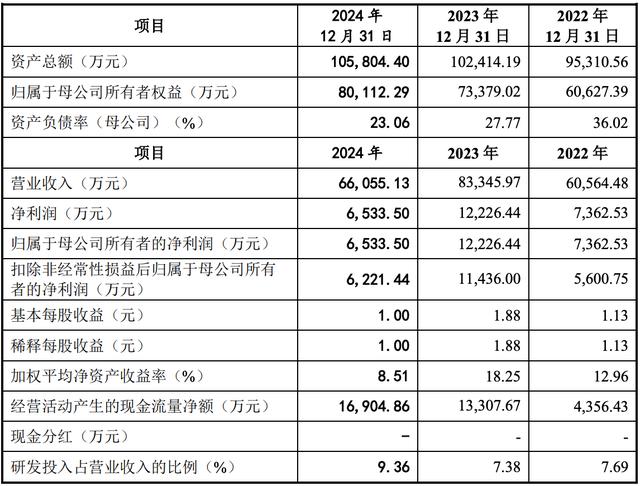 业绩方面,2022年、2023年和2024年,海创光电的营收分别约为6.06亿元、8.33亿元和6.61亿元,净利润分别约为7362.53万元、1.22亿元和6533.50万元,扣非后净利润分别约为5600.75万元、1.14亿元和6221.44万元。