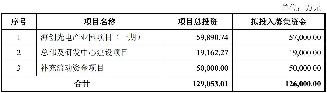 据贝多商业&贝多财经了解,海创光电于2023年5月递交招股书,报考在科创板上市,原计划募资12.60亿元。其中,将用于海创光电产业园项目(一期)、总部及研发中心建设项目,以及补充流动资金项目。
